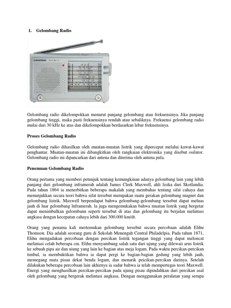 Apabila hal tersebut terjadi terus menerus dalam jangka waktu yang lama maka kesehatan orang tersebut akan. Perambatan gelombang radio perambatan gelombang radio memiliki peranan penting dalam sistem komunikasi tanpa kabel (wireless), karena proses pengiriman informasi dari pengirim (transmitter) menuju penerima (receiver) melalui gelombang radio. Gelombang elektromagnetik termasuk gelombang transfersal. Prinsip kerja dari radio, adalah menangkap gelombang elektromagnetik, kemudian mengubahnya menjadi gelombang dengan frekuensi yang dapat didengar akibatnya, muncul gangguan hebat pada beberapa stasiun radio selama tahun 1976, yang diprotes oleh beberapa negara, termasuk inggris. Gelombang radio atau radio waves dihasilkan oleh muatan listrik yang mengalami akselerasi.